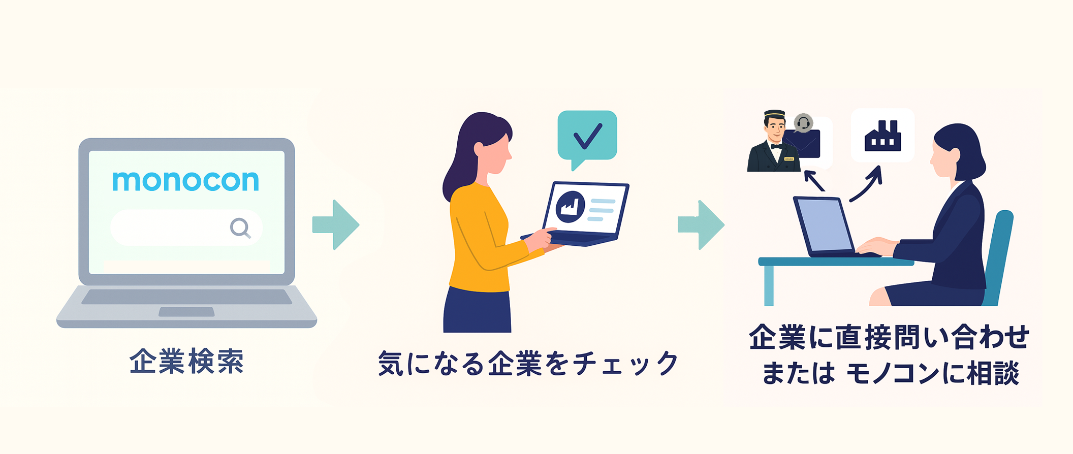 ただし、企業によっては個人からの依頼を受け付けていない場合や、返信までに時間がかかる場合があります。そのためモノコンでは、個人からの依頼にも積極的に対応している企業の紹介や、返信率を高める問い合わせ方法のアドバイスも行っています。